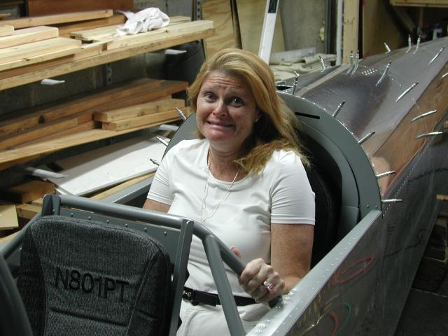 Things are moving along nicely. I have finished running most of the wiring that goes to the fuselage aft of the spar and to the wings. I received my seats from Oregon Aero and thought is was time to see how they felt so I got my girlfriend to sit in the rear seat. She is quite excited about getting the plane finished. The second pic shows how she is already practicing for my flying.